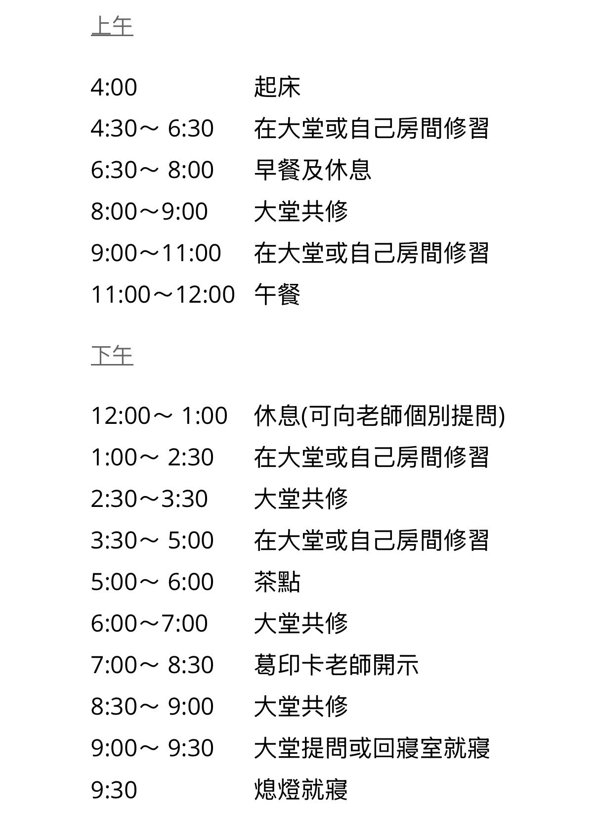 行程是每天早上 4 點起床,晚上 9:30 熄燈,每天靜坐約十小時(嗯,這絕不是輕鬆的度假);其中有三次一個小時的共修,是有中英對照的導引,晚上則會聽葛印卡老師的開示的中文翻譯音檔(Discourse, 我一天中最期待的時光)。